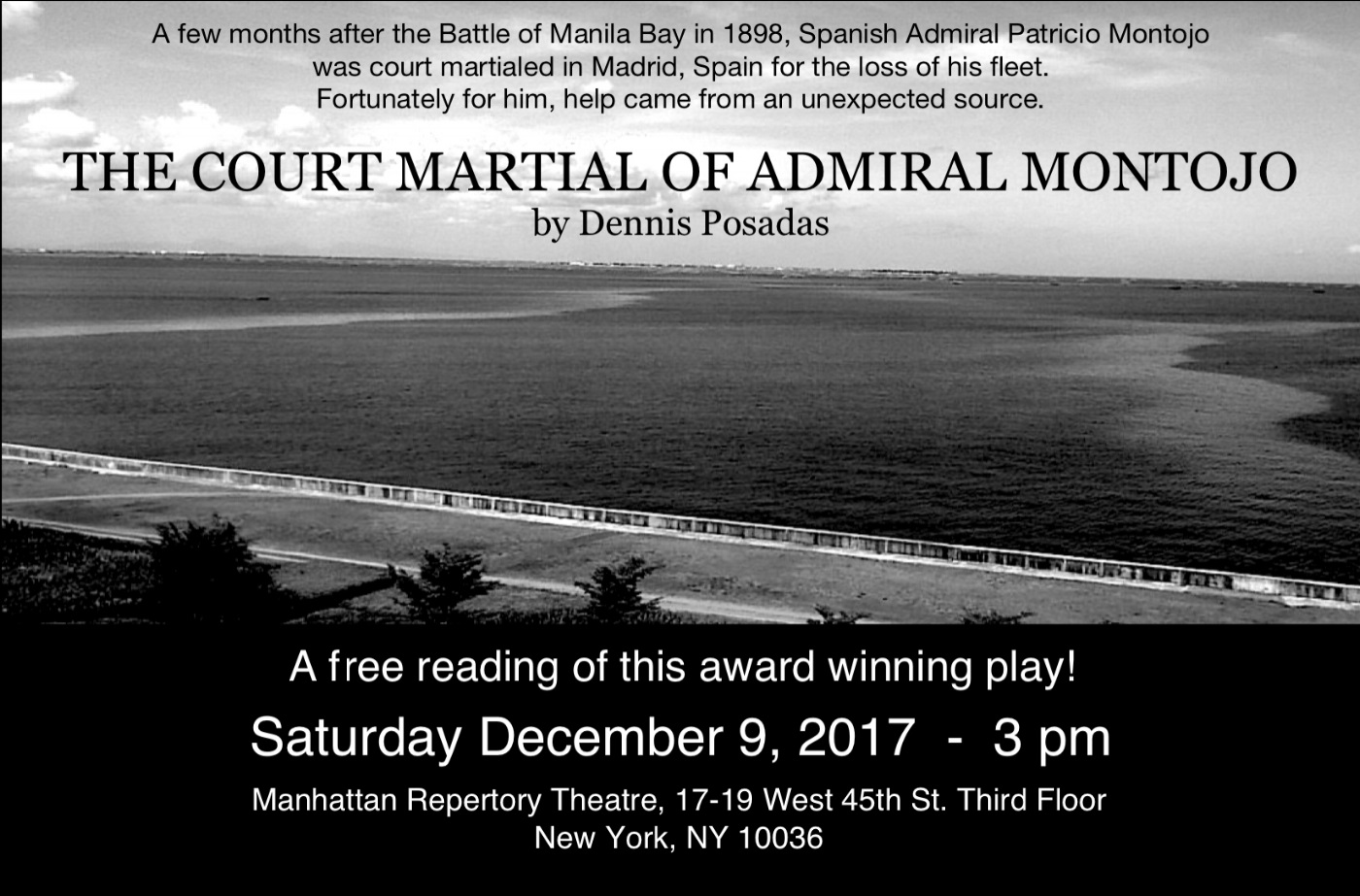 Playwright Dennis Posadas will launch the first reading of his play "The Court Martial of Admiral Montojo" off-Broadway in New York. The public is invited to the free reading on December 9, 2017 Saturday 3pm.